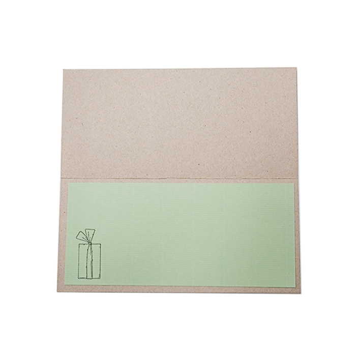 Handgjort kort Julkort Smågranar grönEtt kort där basen är gjord av naturfärgad (oblekt) kartong. På ett grönt papper som är limmat på kortets framsida, sitter fem stycken naturfärgade, urklippta granar limmade som är handmålade i olika mönster i grönt. Granen i mitten sitter limmad med distanser för att ge kortet lite mer djup. Även den lilla naturfärgade fyrkanten nere i högra hörnet är limmad med dessa distanser, där har vi även stämplat texten ”GOD JUL” i svart. Som sista dekoration på kortets framsida har vi limmat tre små gröna, glittriga pärlor. På kortets insida sitter samma vita papper limmat som på kortets framsida. Vi har även stämplat ett fint paket i svart i vänstra hörnet. På kortets baksida har vi stämplat Rosettbutikens logga i en diskret relief. IngårDet ingår ett kuvert i matchande färg och ett lacksigill (som är gjort i vax istället för lack för att klara posthanteringen bättre) med vår logotype som, om man vill, kan fästa på kuvertets baksida för att få ett annorlunda och lite vackrare utseende. (Se bilder) Samt kuvert i samma naturfärgade papper som kortets bas. StorlekDubbelt kort (21 x 9,5 cm) Kuvert E65 (22 x 11 cm) Vikt 25 gram TextFramsida: ”GOD JUL” Insida: Inget DesignRosettbutiken / Mimmi Öxne |