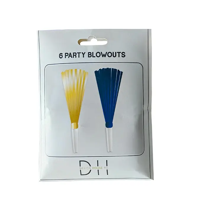 6 stycken tutor som låter både högt och skränigt bra! Ingen missar vart det är fest. Paketet innehåller 6 st tutor varav 3 är med frans i blått silkespapper och 3 i guldigt som fladdrar härligt när man blåser it tutan.