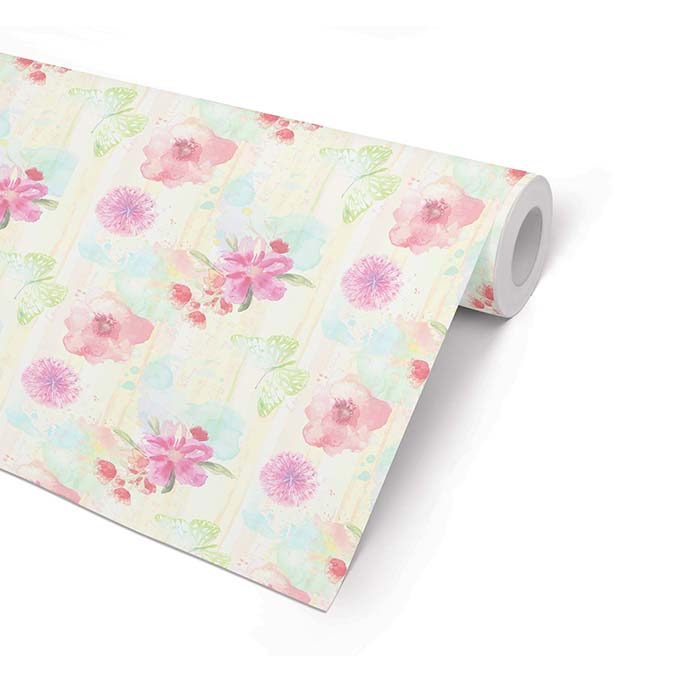 Ett vackert papper med rosa blommor i akvarell på en vit och blå botten. Det är även skria gröna fjärilar på pappret