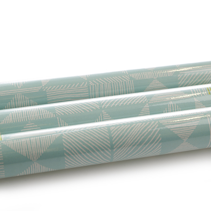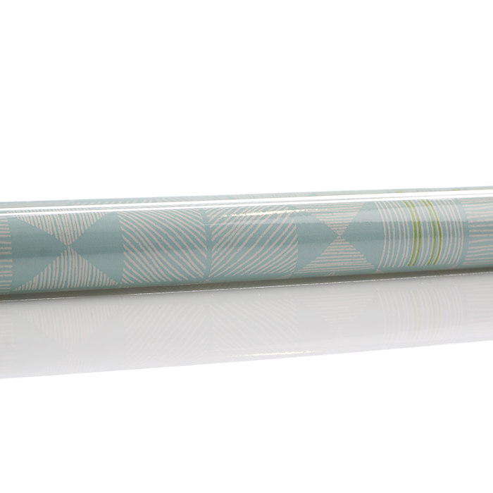 Presentpapper med ljusblå botten med vita och gröna linjer i olika riktningar.