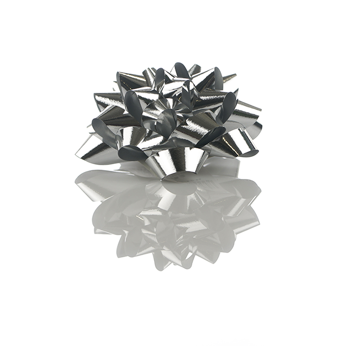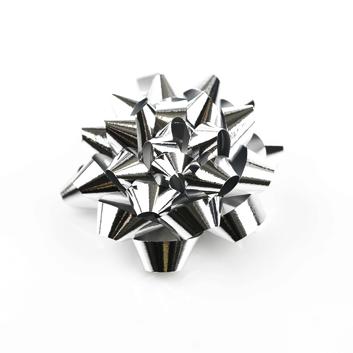 En glänsande rosett gjord av metallicband med många loopar, vilket gör den tät och fyllig.