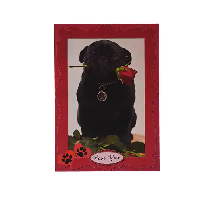 ”Love You” HUnd med röd ros i munnen